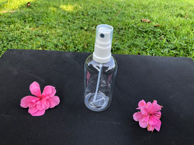 50ml squeezable clear plastic bottle with black/white atomiser (spray).
