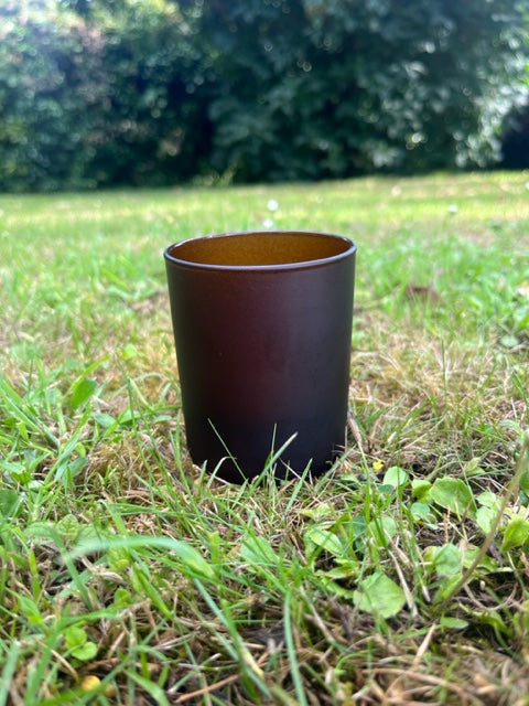 An etched amber 30cl (300ml) glass suitable for candles with thick base. Height 90mm. Diameter is 78mm. Bamboo lid also available. Gloss silver lid...