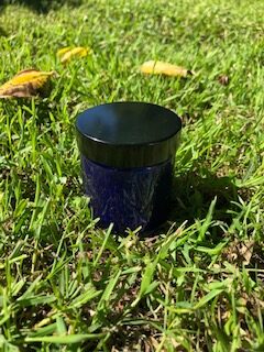 Clear 60ml jars “sprayed” blue with black, white or aluminium cap. 51mm diameter
