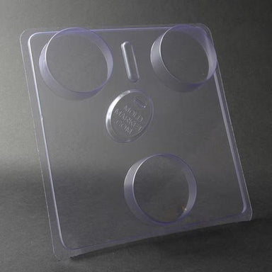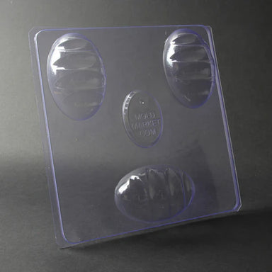 A clear 3 cavity mould. Each cavity holds approximately 150g. 11cm x 7cm x 4.5cm deep. (4.5" x 2.75" x 1.75" deep.)