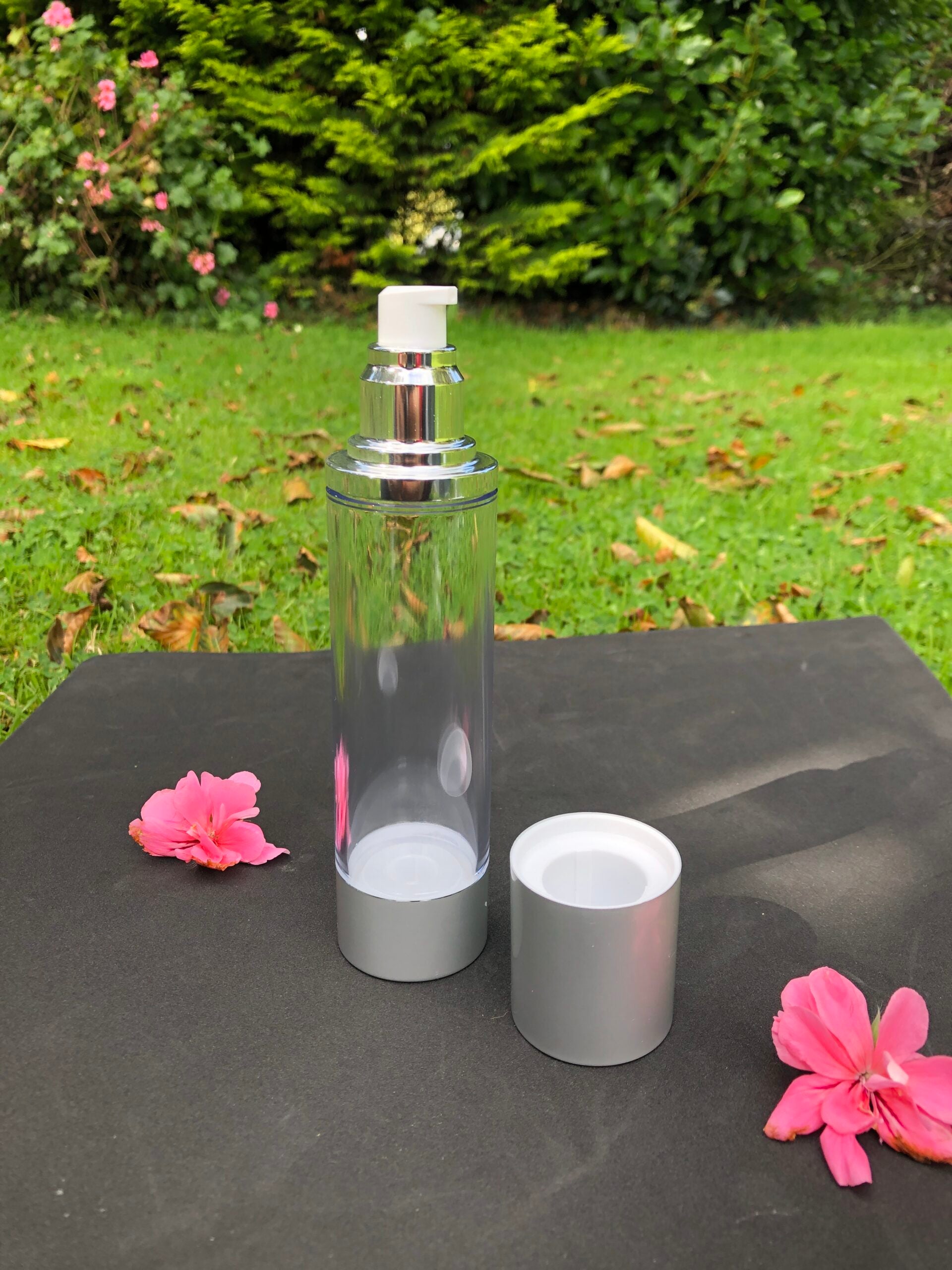 A premium frosted plastic 100ml airless bottle with airless pump. Matt silver overcap. Available in 15, 30 and 50ml sizes.